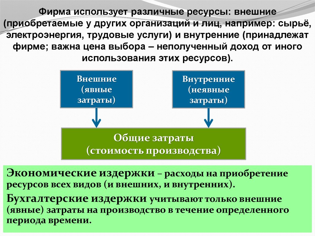 трудовые услуги) и внутренние (принадлежатфирме; важна цена выбора – неполученный доход от иного