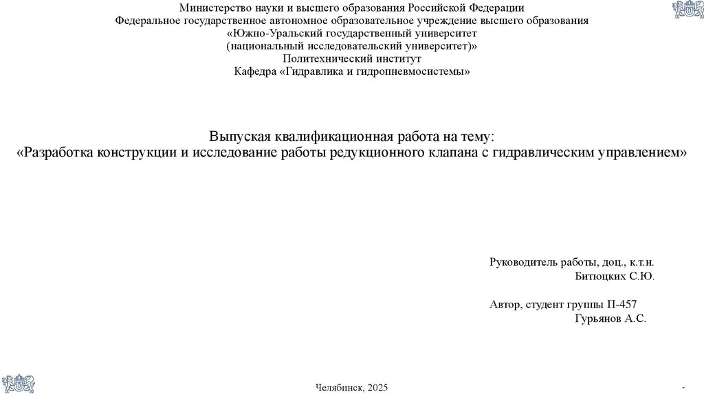 «Разработка конструкции и исследование работы редукционного клапана с гидравлическим управлением»