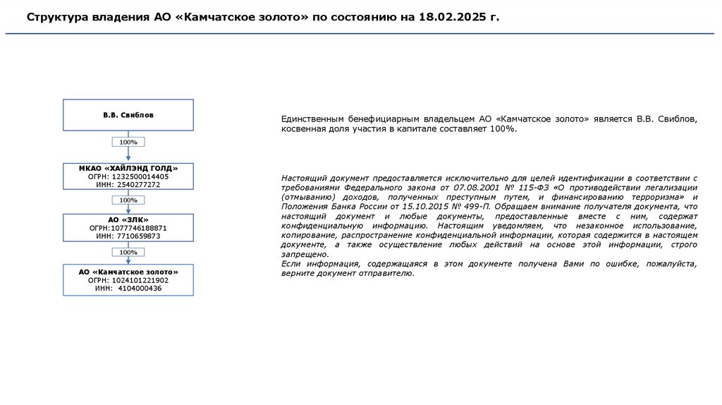 Структура владения АО «Камчатское золото» по состоянию на 18.02.2025 г.В.В. Свиблов