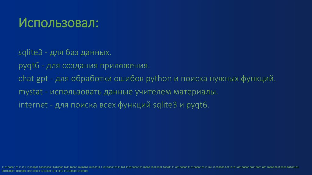 internet - для поиска всех функций sqlite3 и pyqt6.