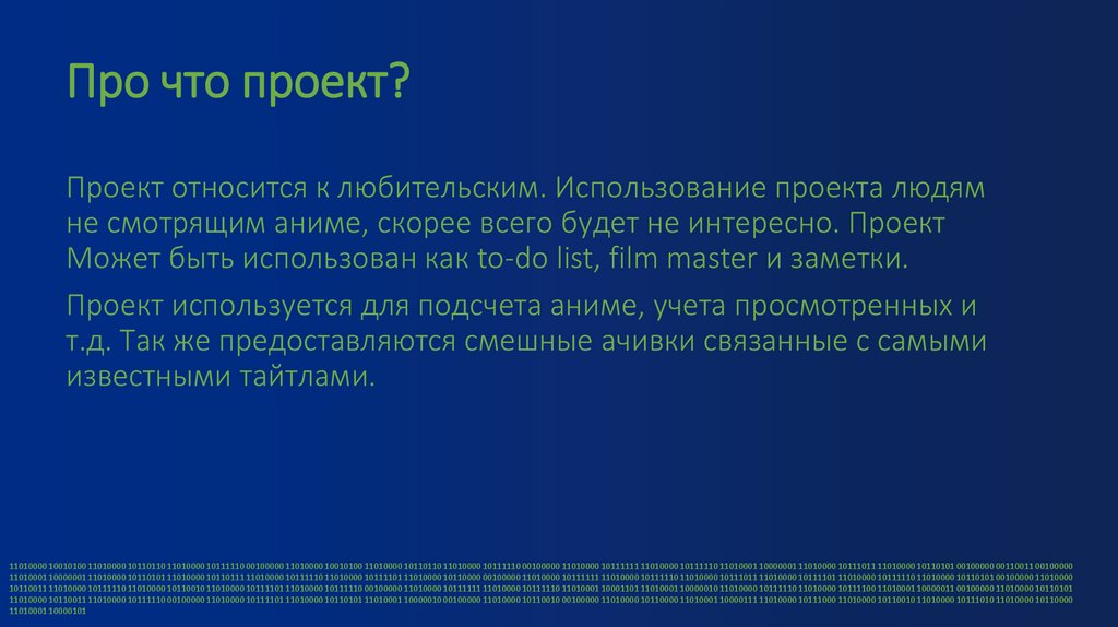 Про что проект?Проект относится к любительским. Использование проекта людям