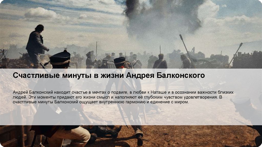 Счастливые минуты в жизни Андрея БалконскогоАндрей Балконский находит счастье в мечтах о подвиге, в любви к Наташе и в осознании важности близких