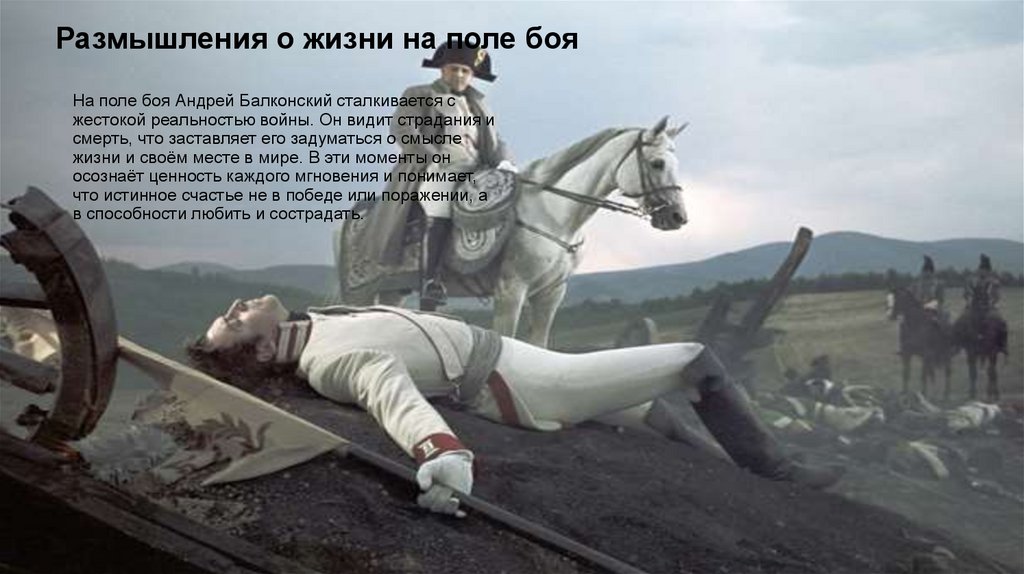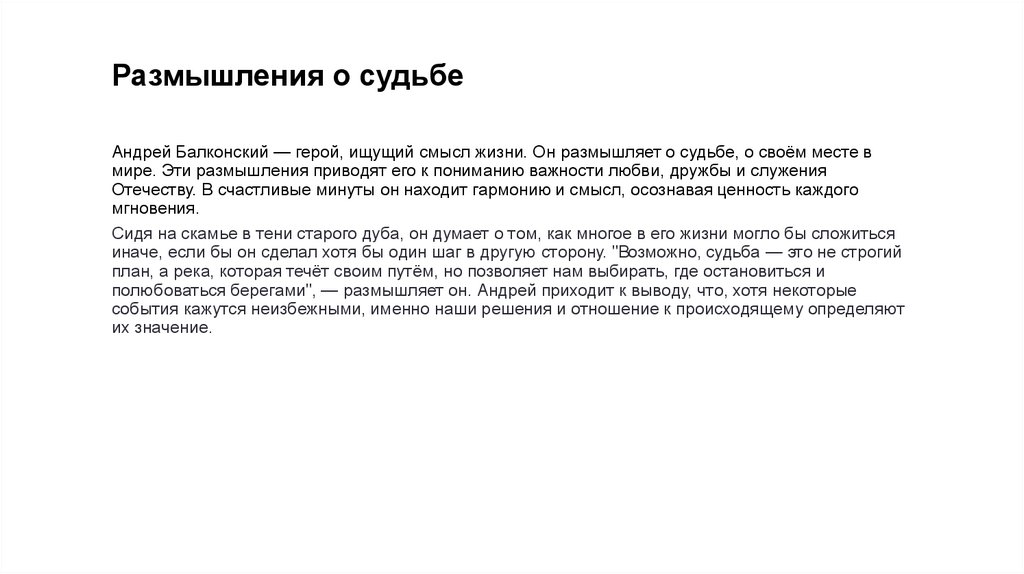 Размышления о судьбеАндрей Балконский — герой, ищущий смысл жизни. Он размышляет о судьбе, о своём месте в