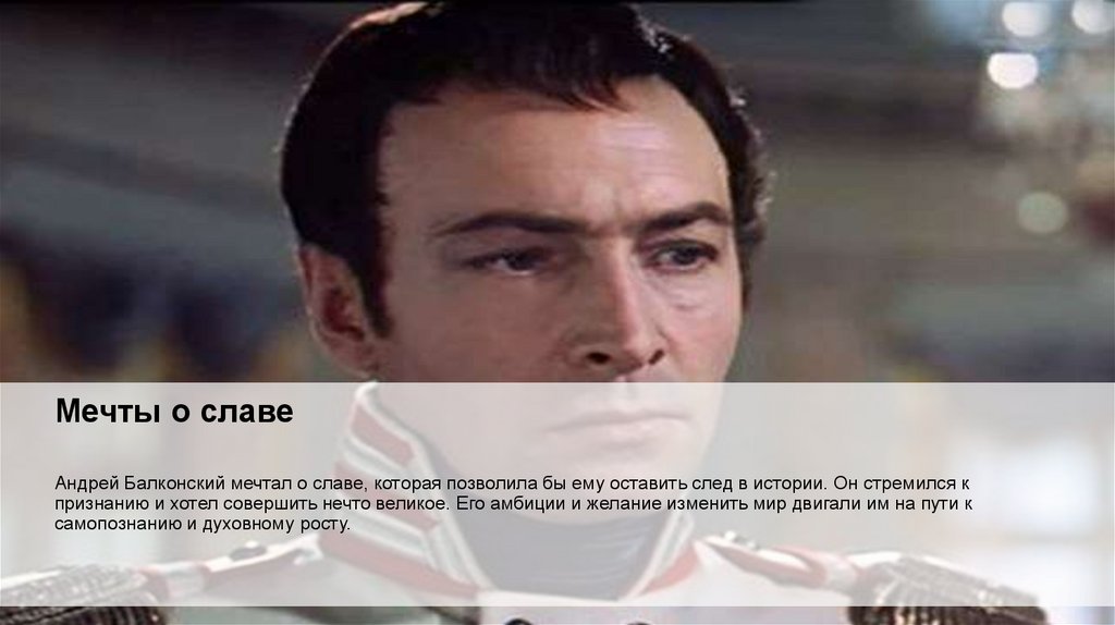 Мечты о славеАндрей Балконский мечтал о славе, которая позволила бы ему оставить след в истории. Он стремился к