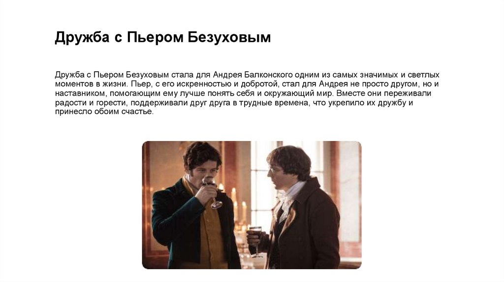 Дружба с Пьером БезуховымДружба с Пьером Безуховым стала для Андрея Балконского одним из самых значимых и светлых