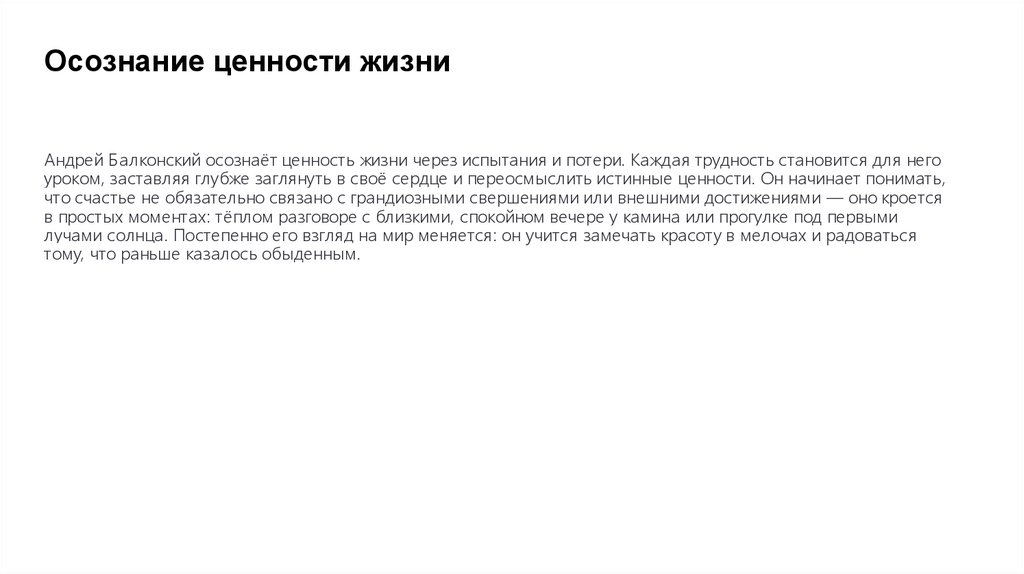 Осознание ценности жизниАндрей Балконский осознаёт ценность жизни через испытания и потери. Каждая трудность становится для него