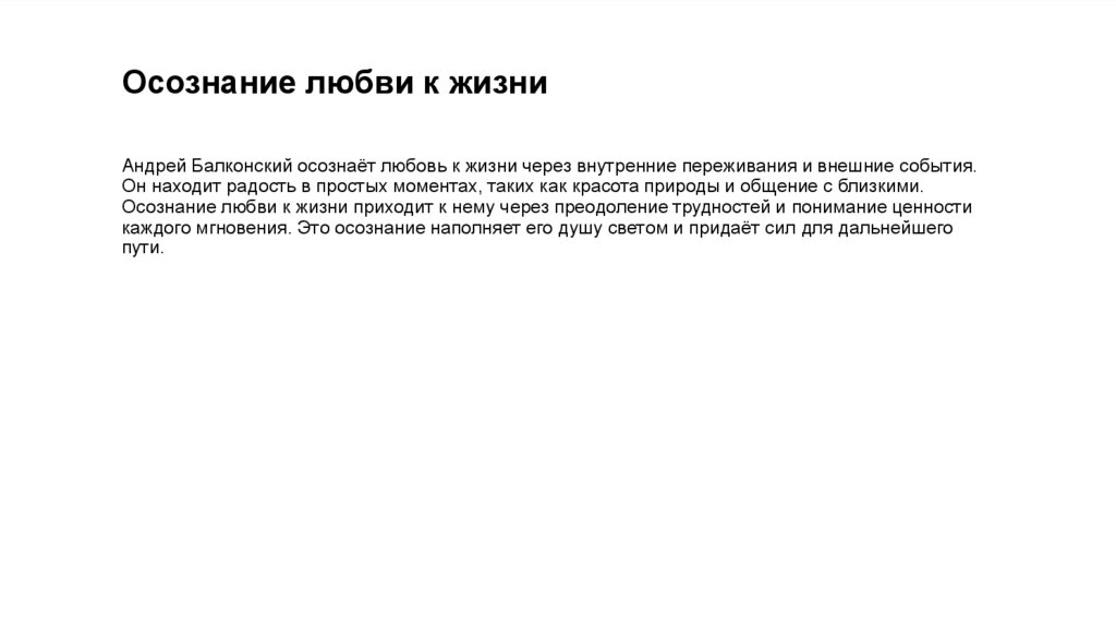 Осознание любви к жизниАндрей Балконский осознаёт любовь к жизни через внутренние переживания и внешние события.