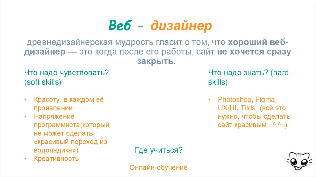 Веб - дизайнердревнедизайнерская мудрость гласит о том, что хороший вебдизайнер — это когда после его работы, сайт не хочется сразу