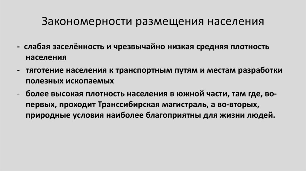 - тяготение населения к транспортным путям и местам разработки