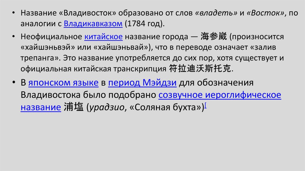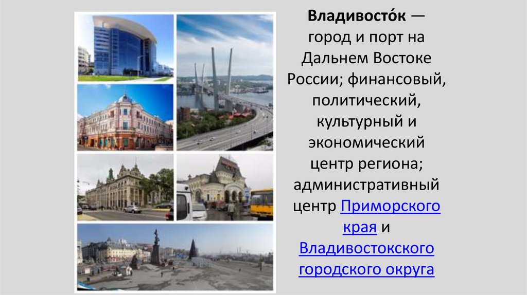 30. Владивосто́к — город и порт на Дальнем Востоке России; финансовый, политический, культурный и экономический центр региона;