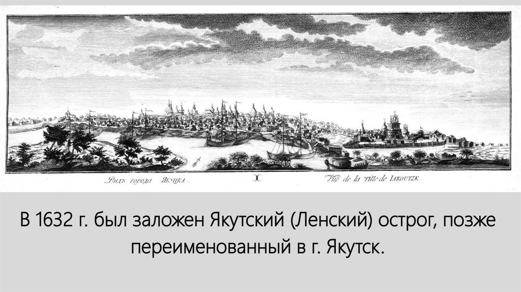 В 1632 г. был заложен Якутский (Ленский) острог, позжепереименованный в г. Якутск.