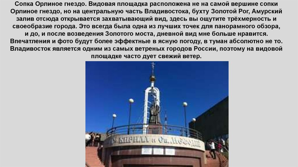 Владивостока, бухту Золотой Рог, Амурскийзалив отсюда открывается захватывающий вид, здесь вы ощутите трёхмерность и