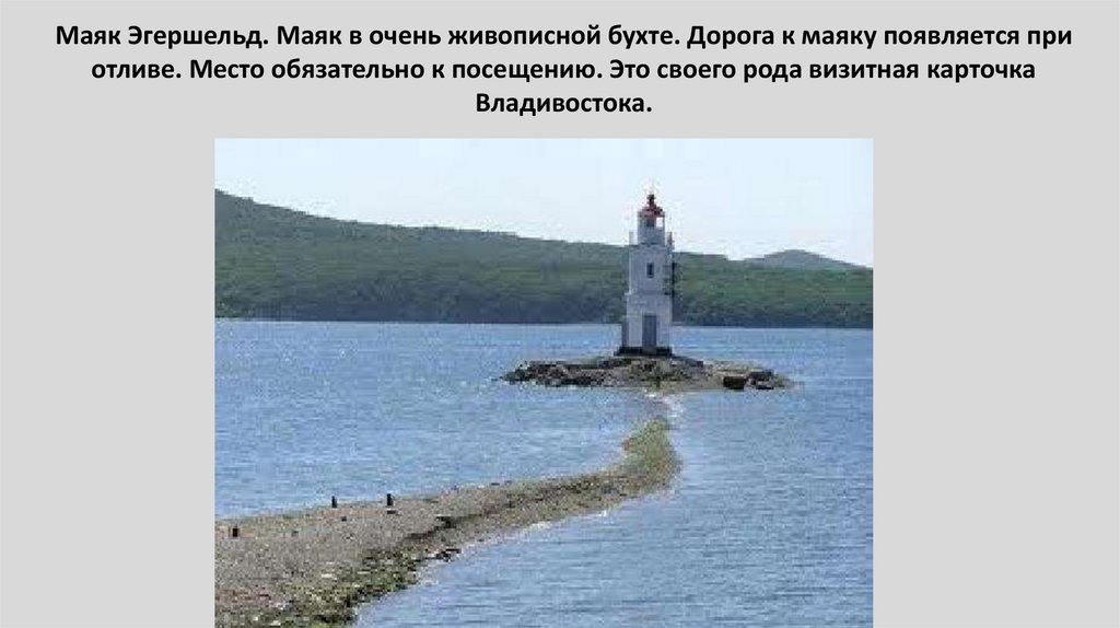 40. Маяк Эгершельд. Маяк в очень живописной бухте. Дорога к маяку появляется при отливе. Место обязательно к посещению. Это своего