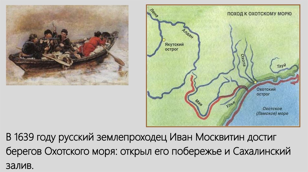 В 1639 году русский землепроходец Иван Москвитин достигберегов Охотского моря: открыл его побережье и Сахалинский