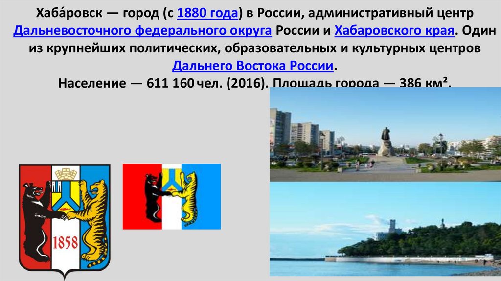 43. Хаба́ровск — город (с 1880 года) в России, административный центр Дальневосточного федерального округа России и Хабаровского