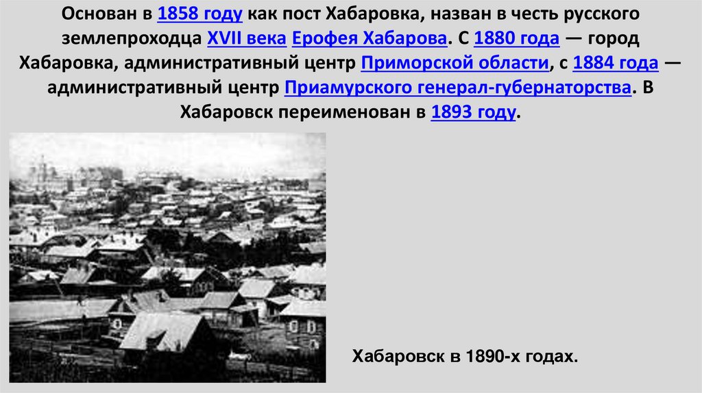 44. Основан в 1858 году как пост Хабаровка, назван в честь русского землепроходца XVII века Ерофея Хабарова. С 1880 года — город