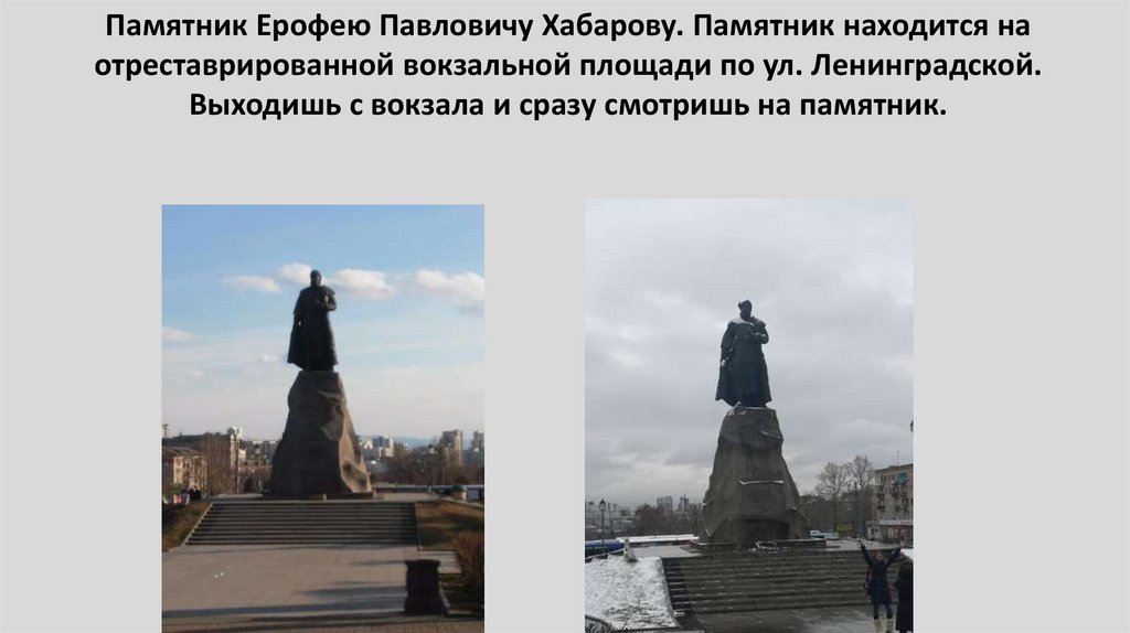 45. Памятник Ерофею Павловичу Хабарову. Памятник находится на отреставрированной вокзальной площади по ул. Ленинградской. Выходишь