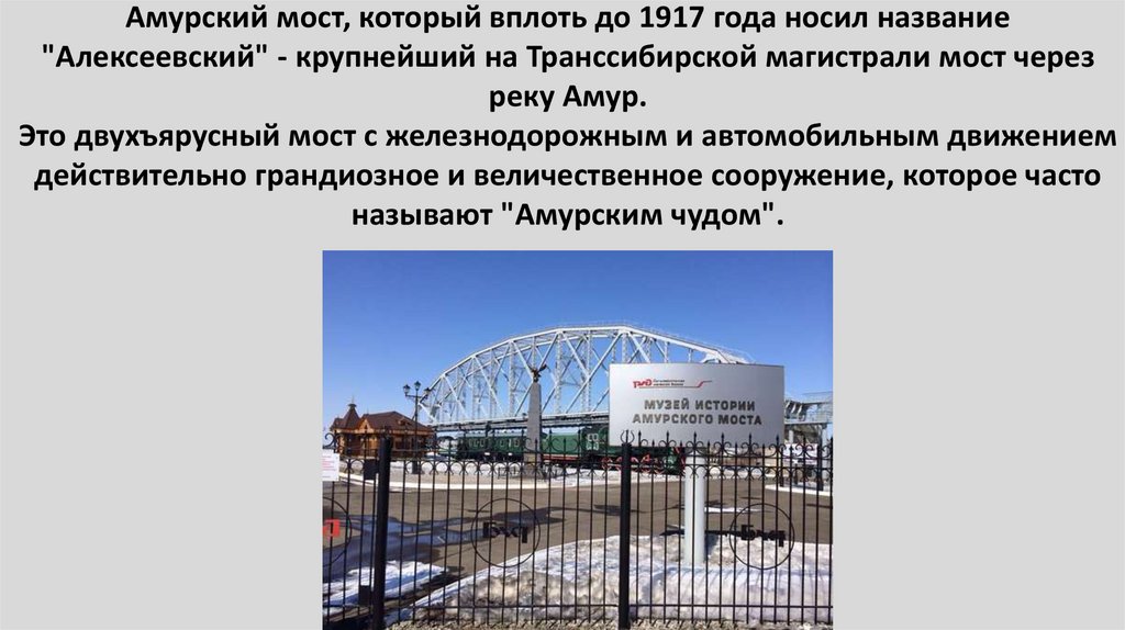 Амурский мост, который вплоть до 1917 года носил название"Алексеевский" - крупнейший на Транссибирской магистрали мост через