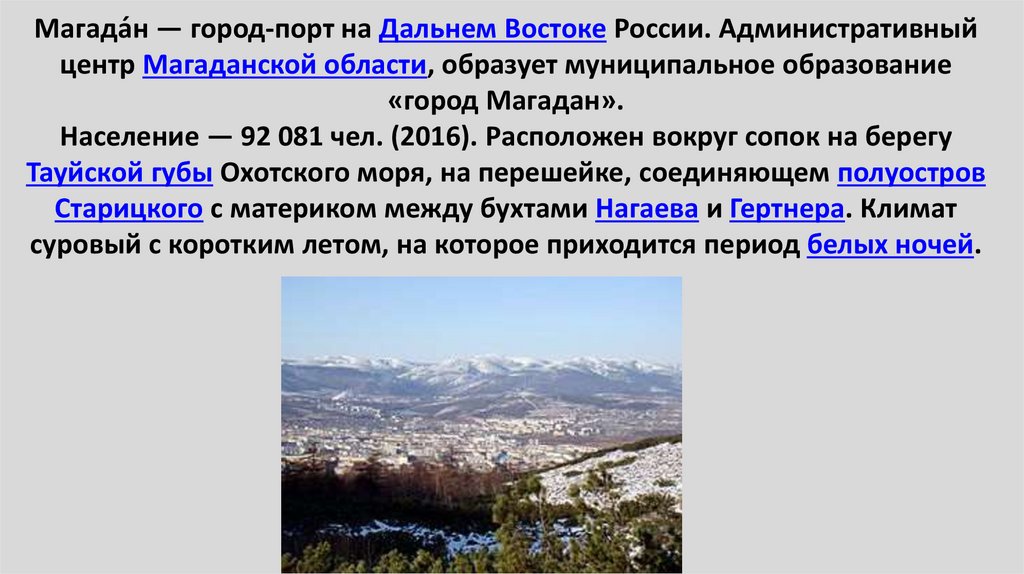 Магада́н — город-порт на Дальнем Востоке России. Административныйцентр Магаданской области, образует муниципальное образование