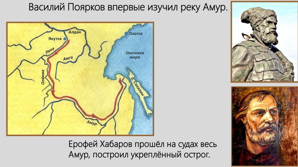 Василий Поярков впервые изучил реку Амур.Ерофей Хабаров прошёл на судах весь