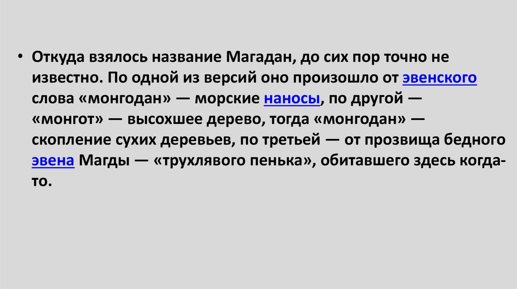 • Откуда взялось название Магадан, до сих пор точно неизвестно. По одной из версий оно произошло от эвенского