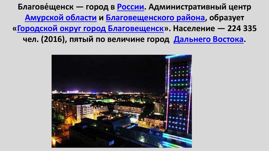 Благове́щенск — город в России. Административный центрАмурской области и Благовещенского района, образует