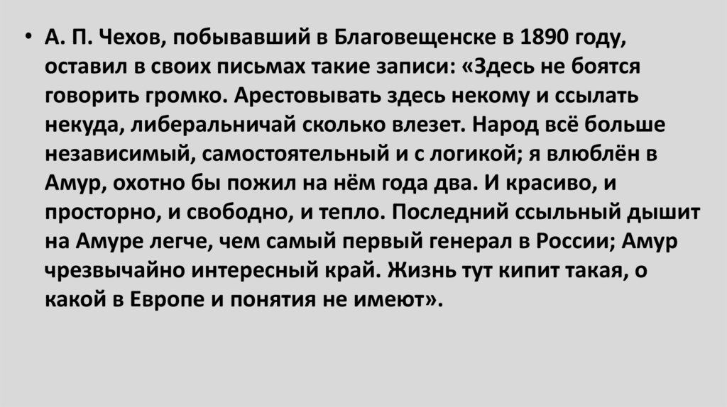 • А. П. Чехов, побывавший в Благовещенске в 1890 году,оставил в своих письмах такие записи: «Здесь не боятся