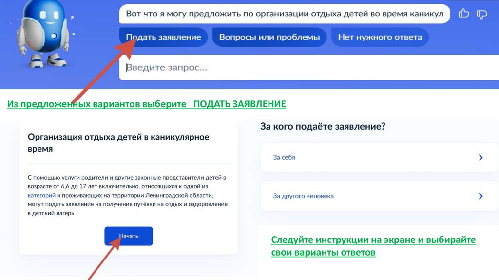 Из предложенных вариантов выберите ПОДАТЬ ЗАЯВЛЕНИЕСледуйте инструкции на экране и выбирайте