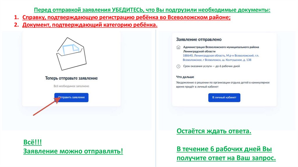 Перед отправкой заявления УБЕДИТЕСЬ, что Вы подгрузили необходимые документы:1. Справку, подтверждающую регистрацию ребёнка во Всеволожском районе;