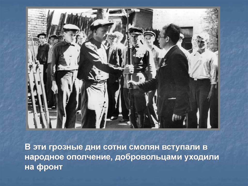 В эти грозные дни сотни смолян вступали внародное ополчение, добровольцами уходили