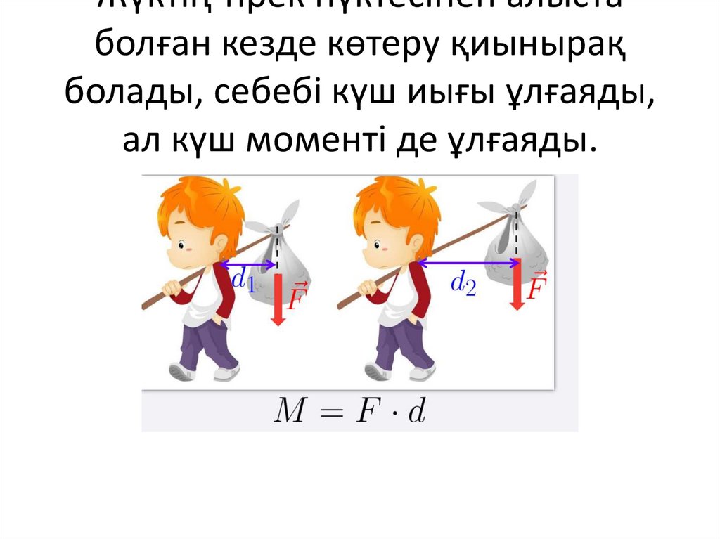 18. Жүктің тірек нүктесінен алыста болған кезде көтеру қиынырақ болады, себебі күш иығы ұлғаяды, ал күш моменті де ұлғаяды.