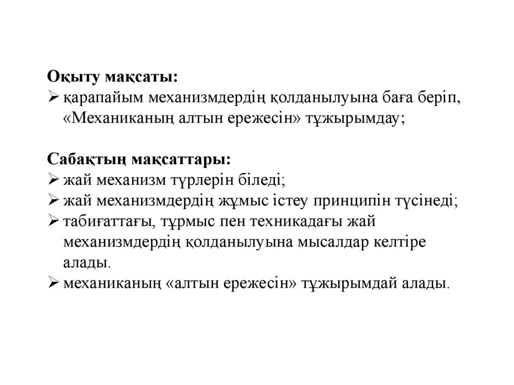 Оқыту мақсаты:қарапайым механизмдердің қолданылуына баға беріп,