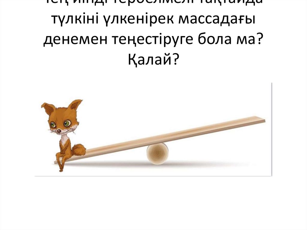 21. Тең иінді тербелмелі тақтайда түлкіні үлкенірек массадағы денемен теңестіруге бола ма? Қалай?
