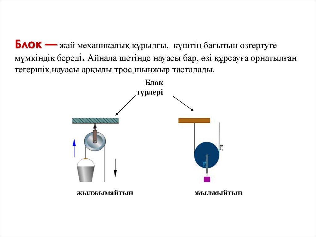 Блок — жай механикалық құрылғы, күштің бағытын өзгертугемүмкіндік береді. Айнала шетінде науасы бар, өзі құрсауға орнатылған