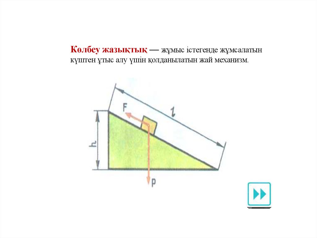 Көлбеу жазықтық — жұмыс істегенде жұмсалатынкүштен ұтыс алу үшін қолданылатын жай механизм.