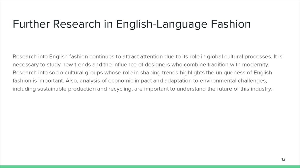 Further Research in English-Language FashionResearch into English fashion continues to attract attention due to its role in global cultural processes. It is