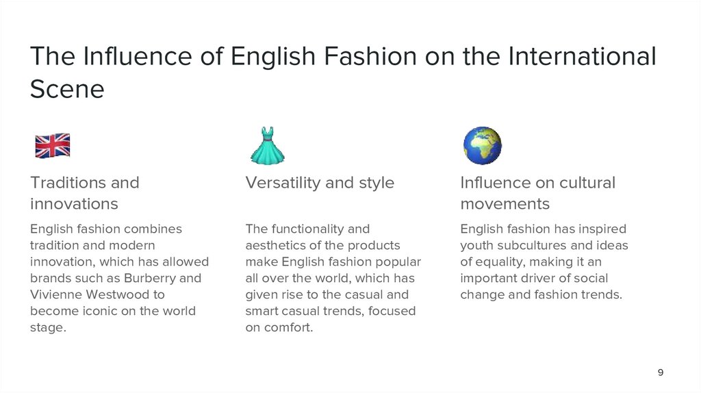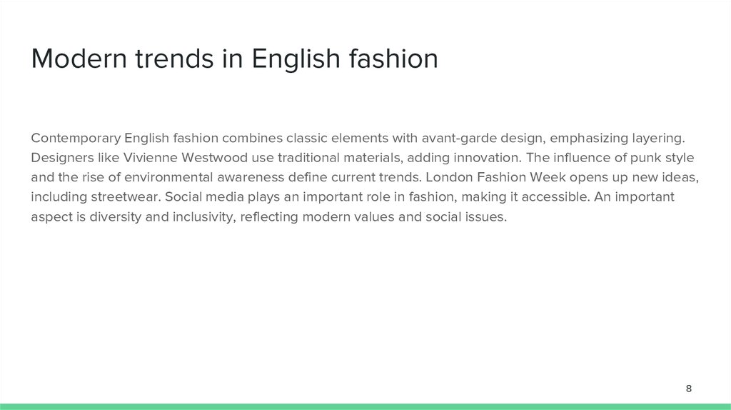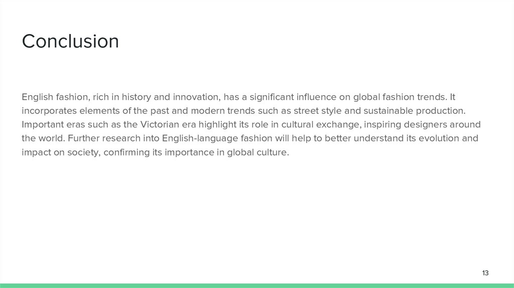 ConclusionEnglish fashion, rich in history and innovation, has a significant influence on global fashion trends. It