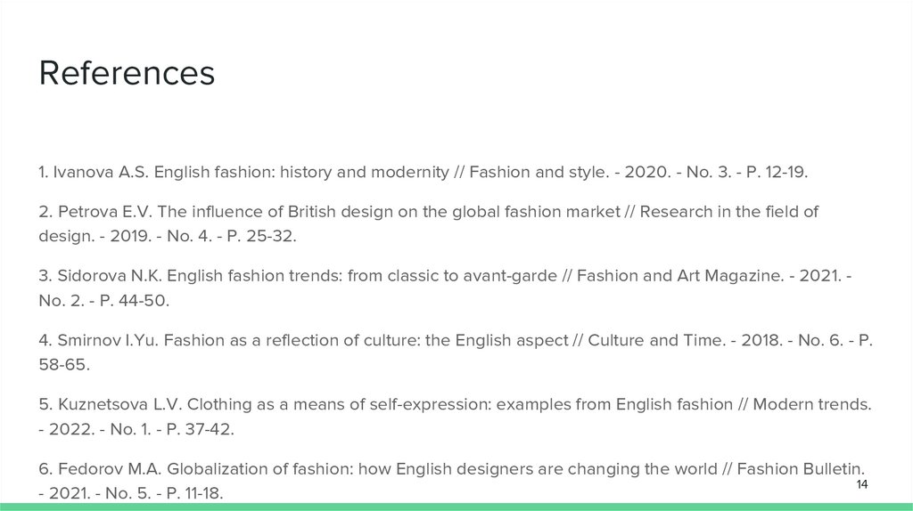 References1. Ivanova A.S. English fashion: history and modernity // Fashion and style. - 2020. - No. 3. - P. 12-19.