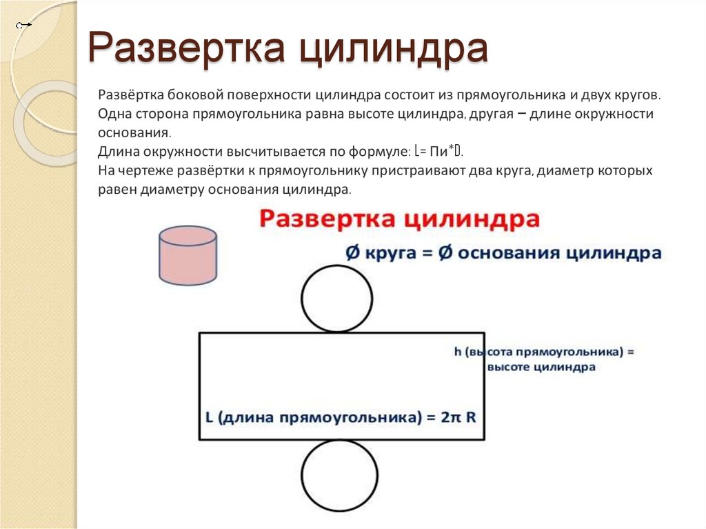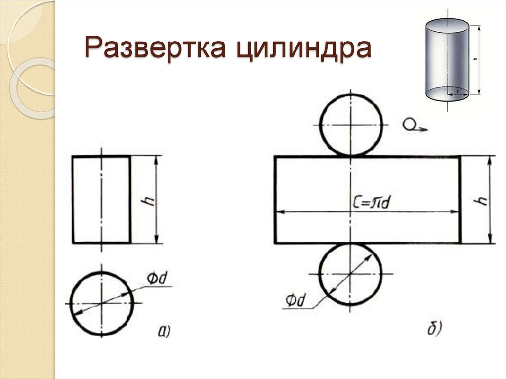 Развёртка боковой поверхности цилиндра состоит из прямоугольника и двух кругов.Одна сторона прямоугольника равна высоте цилиндра, другая – длине окружности
