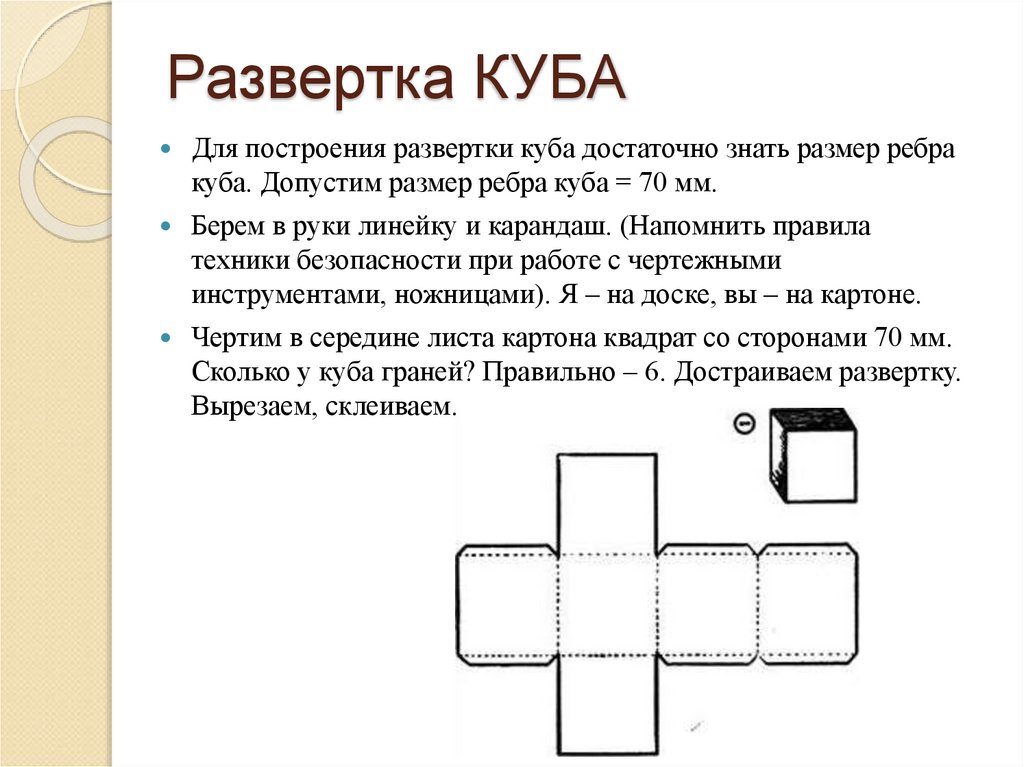 Для построения развертки куба достаточно знать размер ребракуба. Допустим размер ребра куба = 70 мм.