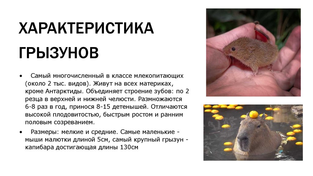 Размеры: мелкие и средние. Самые маленькие мыши малютки длиной 5см, самый крупный грызун капибара достигающая длины 130см