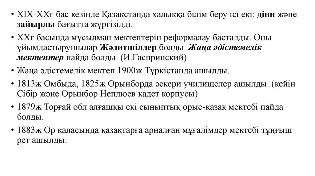 • ХІХ-ХХғ бас кезінде Қазақстанда халыққа білім беру ісі екі: діни жәнезайырлы бағытта жүргізілді.