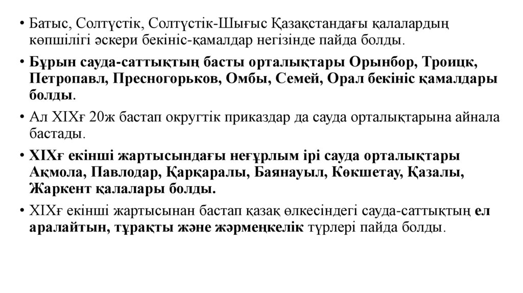 • Ал ХІХғ 20ж бастап округтік приказдар да сауда орталықтарына айнала
