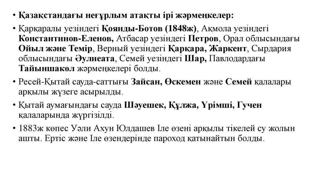 • Қазақстандағы неғұрлым атақты ірі жәрмеңкелер:• Қарқаралы уезіндегі Қоянды-Ботов (1848ж), Ақмола уезіндегі