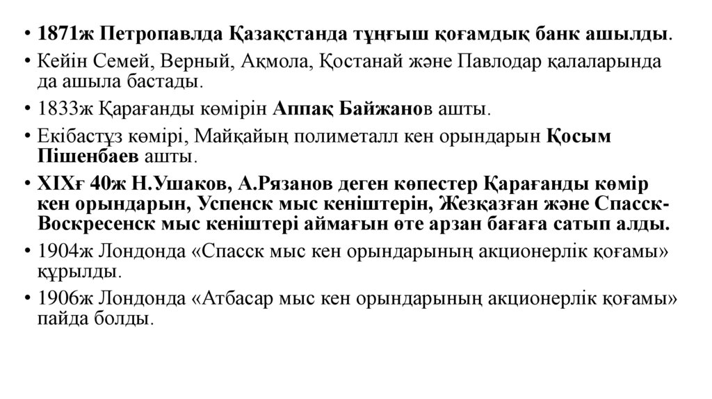 • 1871ж Петропавлда Қазақстанда тұңғыш қоғамдық банк ашылды.• Кейін Семей, Верный, Ақмола, Қостанай және Павлодар қалаларында