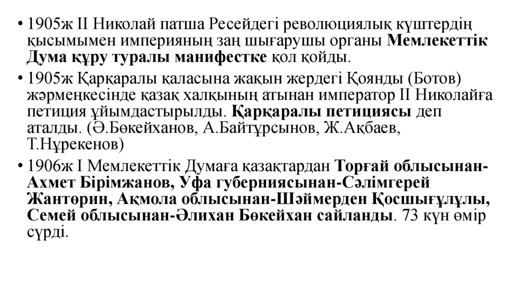 • 1905ж ІІ Николай патша Ресейдегі революциялық күштердіңқысымымен империяның заң шығарушы органы Мемлекеттік