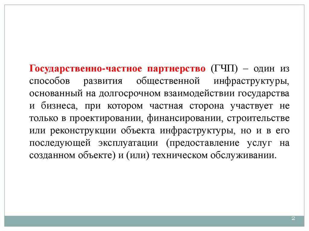 Государственно-частное партнерство (ГЧП) – один изспособов развития общественной инфраструктуры,