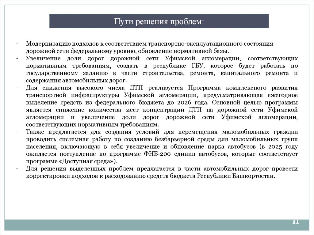 Для решения выделенных проблем предлагается в части автомобильных дорог провести