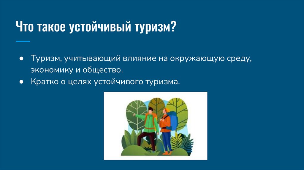 Что такое устойчивый туризм?● Туризм, учитывающий влияние на окружающую среду,
