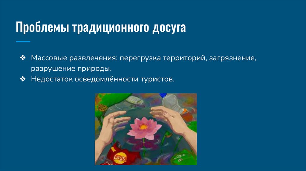 Проблемы традиционного досуга❖ Массовые развлечения: перегрузка территорий, загрязнение,